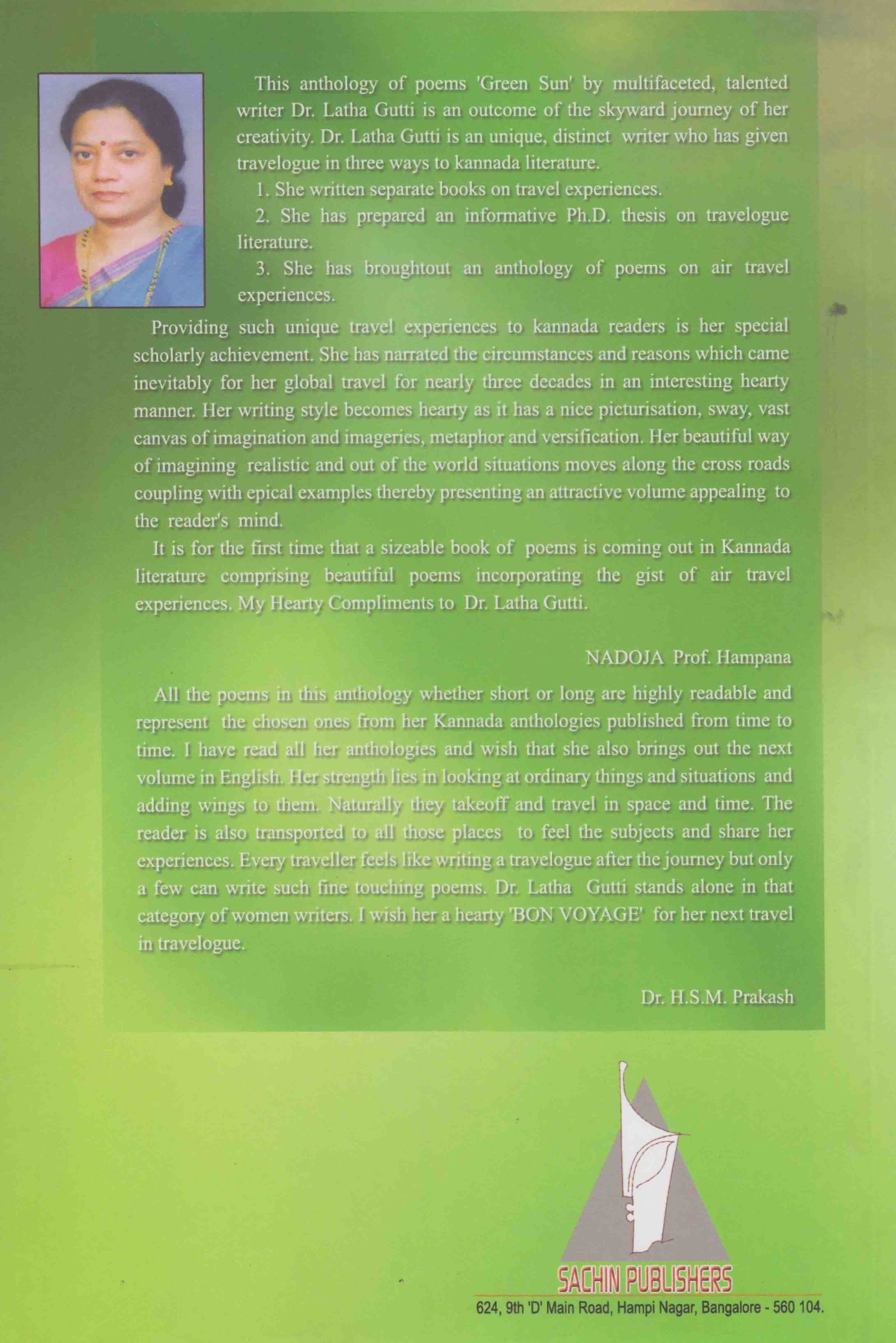 This anthology of poems ‘Green Sun’ by multifacted, talented writer Dr.Lata Gutti is an outcome of the skyward journey of her creativity. Dr. Lata Gutti is an unique, distinct writer who has given travelogue in three ways to kannada literature.