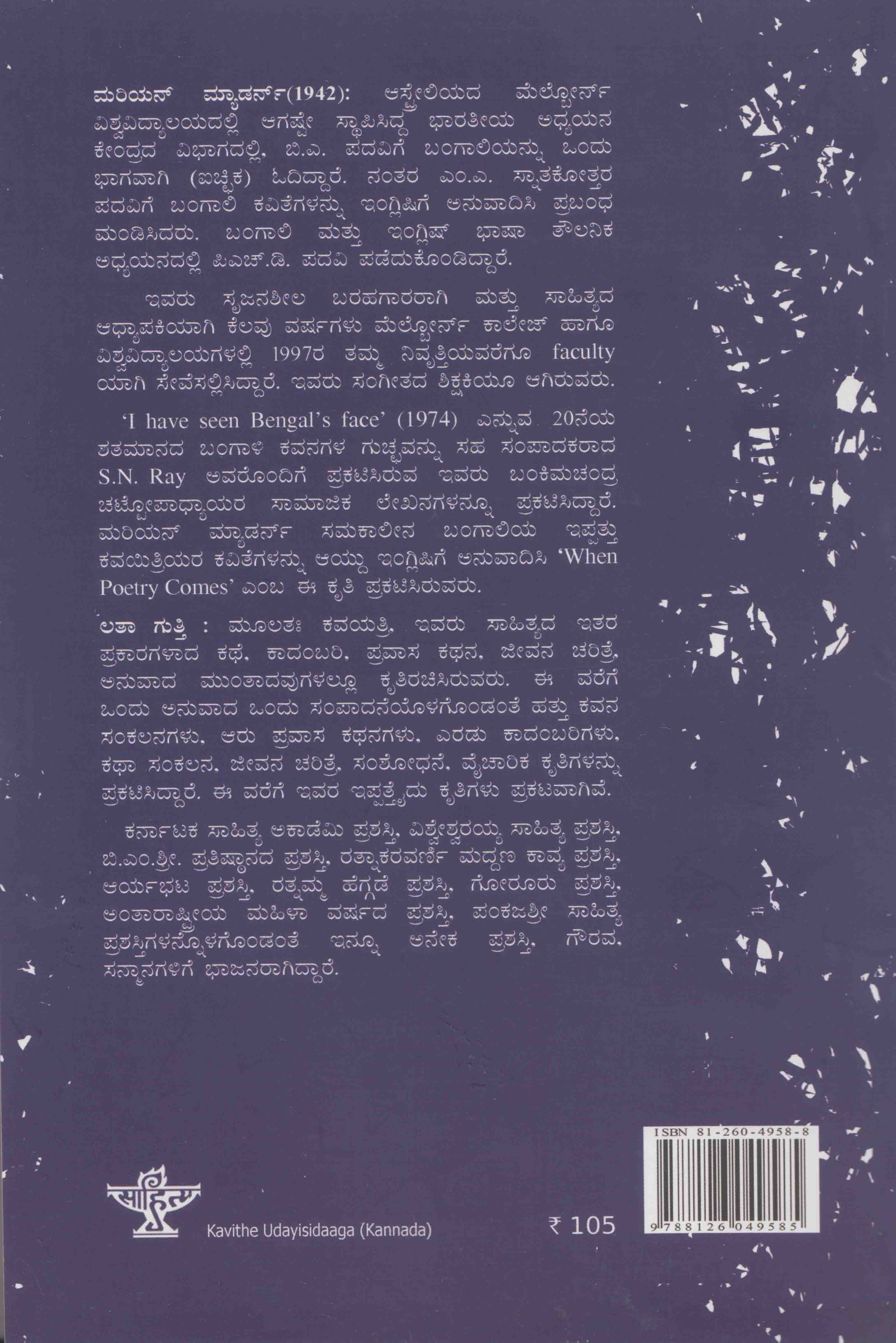 ‘I have seen Bengal’s face’ (1974) J£ÀÄߪÀ 20£ÉAiÀÄ ±ÀvÀªÀiÁ£ÀzÀ §AUÁ½ PÀªÀ£ÀUÀ¼À UÀÄZÀÒªÀ£ÀÄß ¸ÀºÀ ¸ÀA¥ÁzÀPÀgÁzÀ J¸ï.J£ï.gÁAiÀiï CªÀgÉÆA¢UÉ ¥ÀæPÀn¹gÀĪÀ EªÀgÀÄ §AQªÀÄZÀAzÀæ ZÀmÉÆÖÃ¥ÁzsÁåAiÀÄgÀ ¸ÁªÀiÁfPÀ ¯ÉÃR£ÀUÀ¼À£ÀÄß ¥ÀæPÀn¹zÁÝgÉ. ªÀÄjAiÀÄ£ï ªÀiÁåqÀ£ïð ¸ÀªÀÄPÁ°Ã£À §AUÁ°AiÀÄ E¥ÀàvÀÄÛ PÀªÀAiÀÄwæAiÀÄgÀ PÀ«vÉUÀ¼À£ÀÄß DAiÀÄÄÝ EAVè¶UÉ C£ÀĪÁ¢¹ ‘When Poetry Comes’ JA§ F PÀÈw ¥ÀæPÀn¹gÀĪÀgÀÄ.